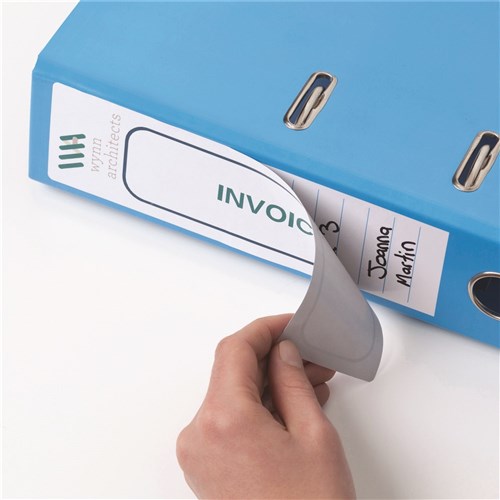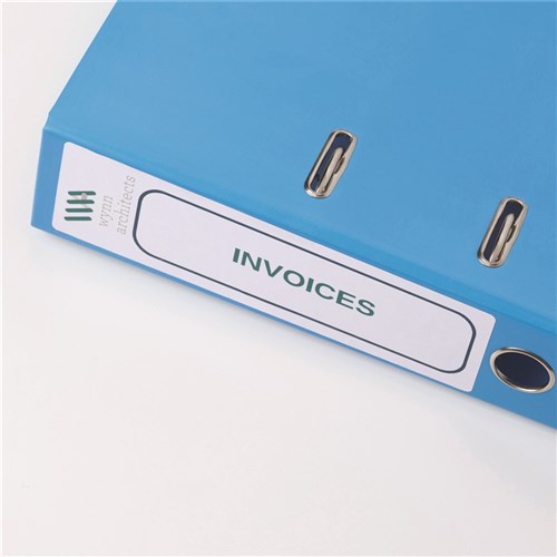 • Specially designed labels to fit the spine of lever arch, ring binders, elasticated folders, box files, suspension files, document wallets and square cut folders.