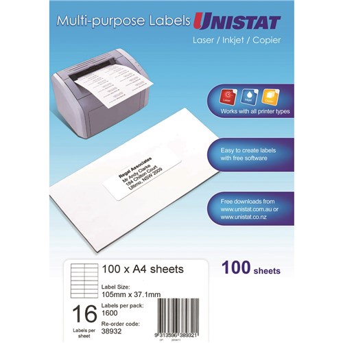 Suitable for laser, inkjet and copiers. Supported by free software at www.unistat.com.au. Size: 105x37mm 1600 labels, 100 sheets, 16 labels per sheet (16UP).