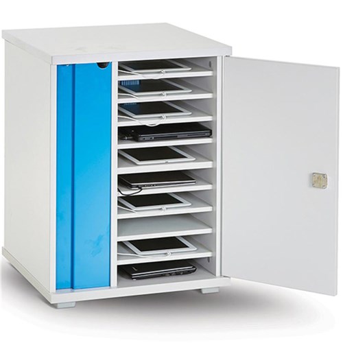 Charges 10 devices up to 15 Inch screen size. Device adaptors plug into 2 x 5-way power strips designed and manufactured in-house. Angled sockets accommodate larger adaptors and plugs without blocking adjacent outlets. Simultaneous charging of all 10 devices to ensure devices are fully charged as fast as possible. Built to commercial grade furniture standards, passing tests for durability, stability and weight bearing loads for high impact usage. Top surface overhangs at the rear to allow the top surface to sit flush against the wall but still allowing fresh air to circulate through the back of the unit. Tested to comply with Healthcare Infection Control Procedures to ensure unit can be cleaned thoroughly, according to healthcare guidelines, preventing the spread of infection. Key locking system, tested by an independent locksmith, includes 7-pin activation and double-sided key with two sets of teeth, making the lock more durable, impossible to pick and substantially increasing security. Lifetime Warranty (5 years Electrical).