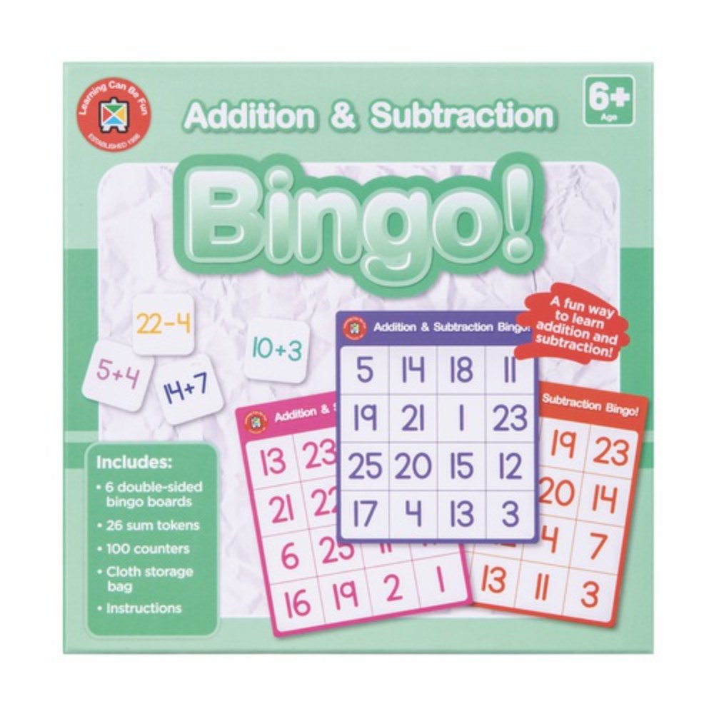 A valuable resource to encourage learning through play. This easy-to-play game will help teach children to add and subtract using numbers 0 to 25. Aided by large, colourful numbers, early learners will quickly learn addition and subtraction sums while having fun. Includes: 6 double-sided bingo boards, 26 sum tokens, 100 counters, cloth storage bag and instructions.