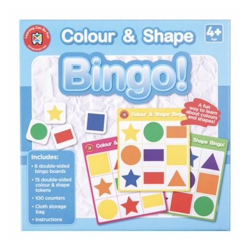 A valuable resource to encourage learning through play. This easy-to-play game will help teach children 6 common colours and 5 basic shapes. Includes: 6 double-sided bingo boards, 15 double-sided colour and shape tokens, 100 counters, cloth storage bag and instructions.