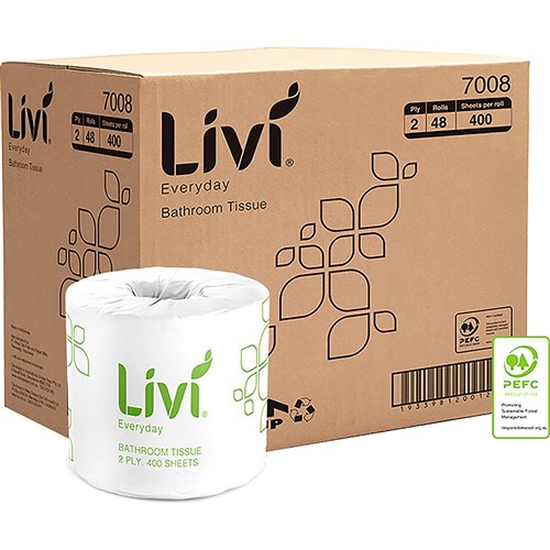 A practical solution for a busy bathroom with the soft 2 ply paper bonded for dependability and comfort. Each roll is wrapped in stylish individual packing for improved hygiene and presentation. 100% sustainable virgin fibre that is independently certified annually by PEFC. To suit Livi toilet dispenser 5500, 5501 and 5502.