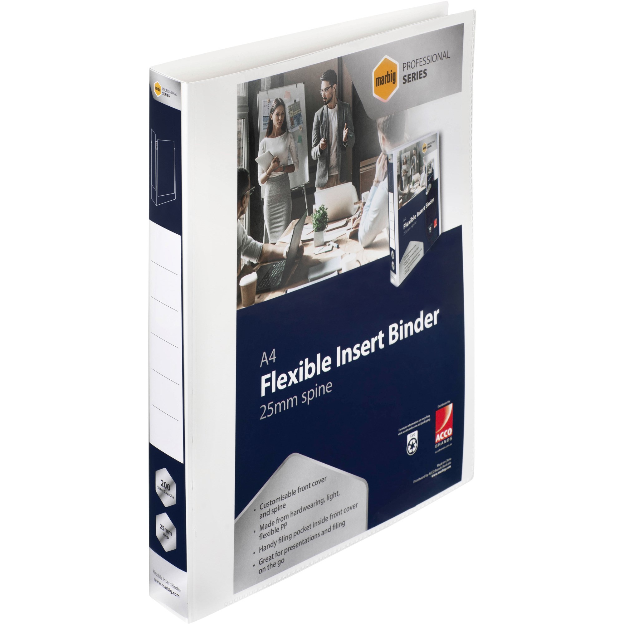 A4 Polypropylene insert binder, clear overlay face and spine, clear deluxe pocket inside front cover. Environmentally friendly. Environmentally friendly choice for your filing. Clear non-glare overlay on front, back and spine to quickly and easily customise your file. Part of the Marbig Professional range.