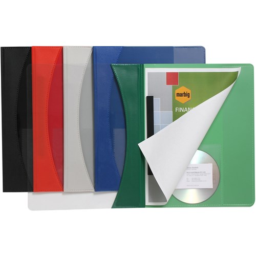 Semi-rigid A4 file with a clear front cover. Inside back cover with vertical pocket, CD holder and business card holder. Features 2 prong fastener to secure documents. Just punch your papers and insert. This allows you to edit your report easily and quickly. Includes a slide bar over the 2 prong fastener to secure contents and enhance appearance. Simply punch up to 40 pages and insert.