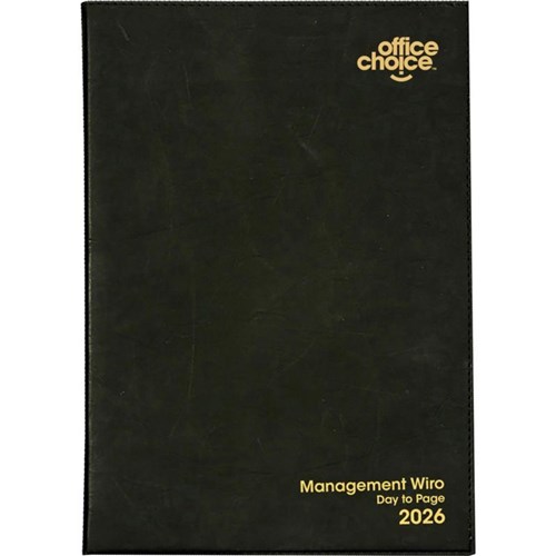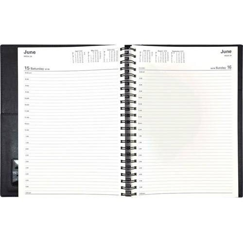 Flexible PVC cover management wiro diary, stitched edges and deluxe pocket inside the cover. Twin wiro allows you to lay the diary flat on your desk. Includes Australian and New Zealand holidays and school terms. Reference calendars. World holidays. 30 minute appointment times 8:00am - 6:00pm. Conversion table. International and National dialling codes. Weights and measures table. International paper sizes. Staff leave. Monthly expenses. Current planner.