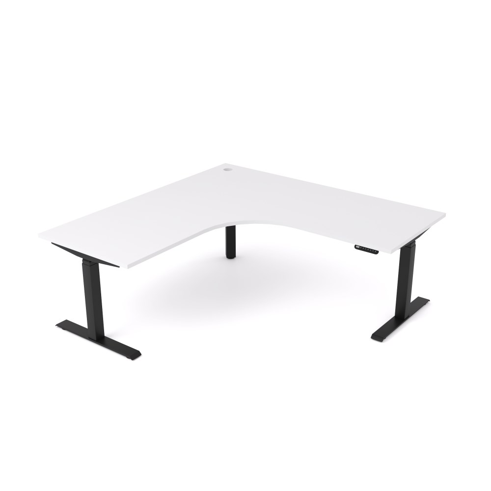 Height adjustable 90 degree workstation left hand return Black frame White top. Dimensions: 1800/1800W x 750D x 620-1270mmH. 140kg weight rating. LED display handset with 4x programmable memory presets. Built in anti-collision software. Adjustment speed 30mm/s. 70mm x 70mm Sturdy, powdercoated steel frame. 10 Year Manufacturer's Warranty. Delivery, installation and assembly charges may apply to furniture. Please enquire to confirm.