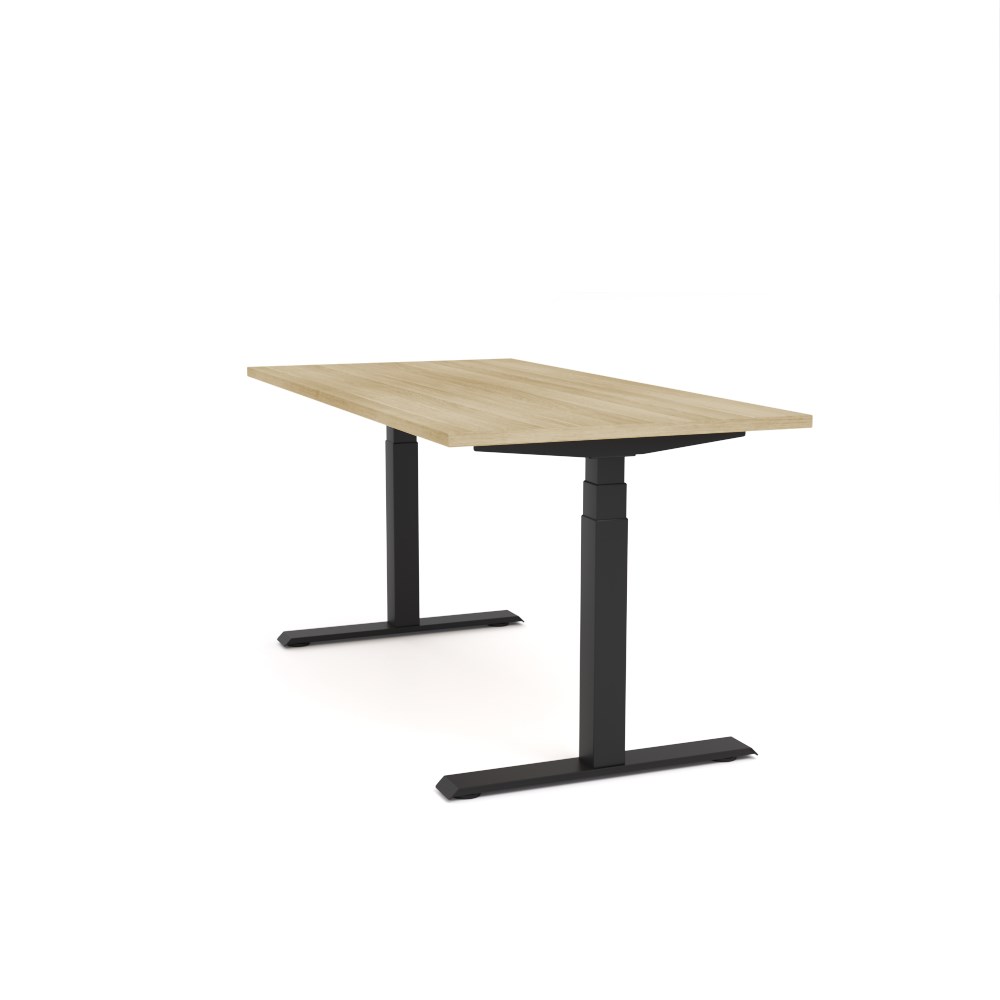 Height adjustable Black frame New Oak top. Dimensions: 1200W x 750D x 685-1130mmH (incl worktop). 160 kg weight rating (evenly distributed). 3 stage, 4 point memory control with LCD readout, programmable to restrict min/max height and to set anti-collision sensitivity. 90 x 60mm legs. Flat foot design. Electric Double motor concealed in each leg and only 40db whilst in operation. Commercial grade 25mm worktops finished with matching 2mm PVC edge. 10 Year Manufacturer's Warranty. Delivery, installation and assembly charges may apply to furniture. Please enquire to confirm.