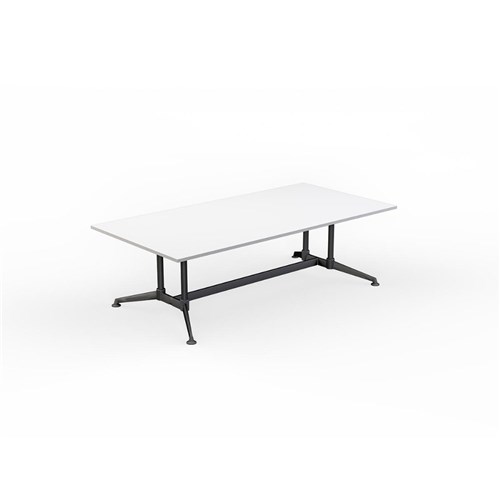 White top all black frame. Universal leg style that supports many table designs. Distinctive A-shaped rail and socket system securely locks the table together and gives immense strength. Perfect for boardroom or meeting table. Frames finished in Matt Black powdercoat with black feet, collars and connectors. 25 mm worksurfaces finished in White melamine on E0 grade substrate with matching PVC edge. Levelling guides. 10 Year Manufacturer's Warranty. Delivery, installation and assembly charges may apply to furniture. Please enquire to confirm.