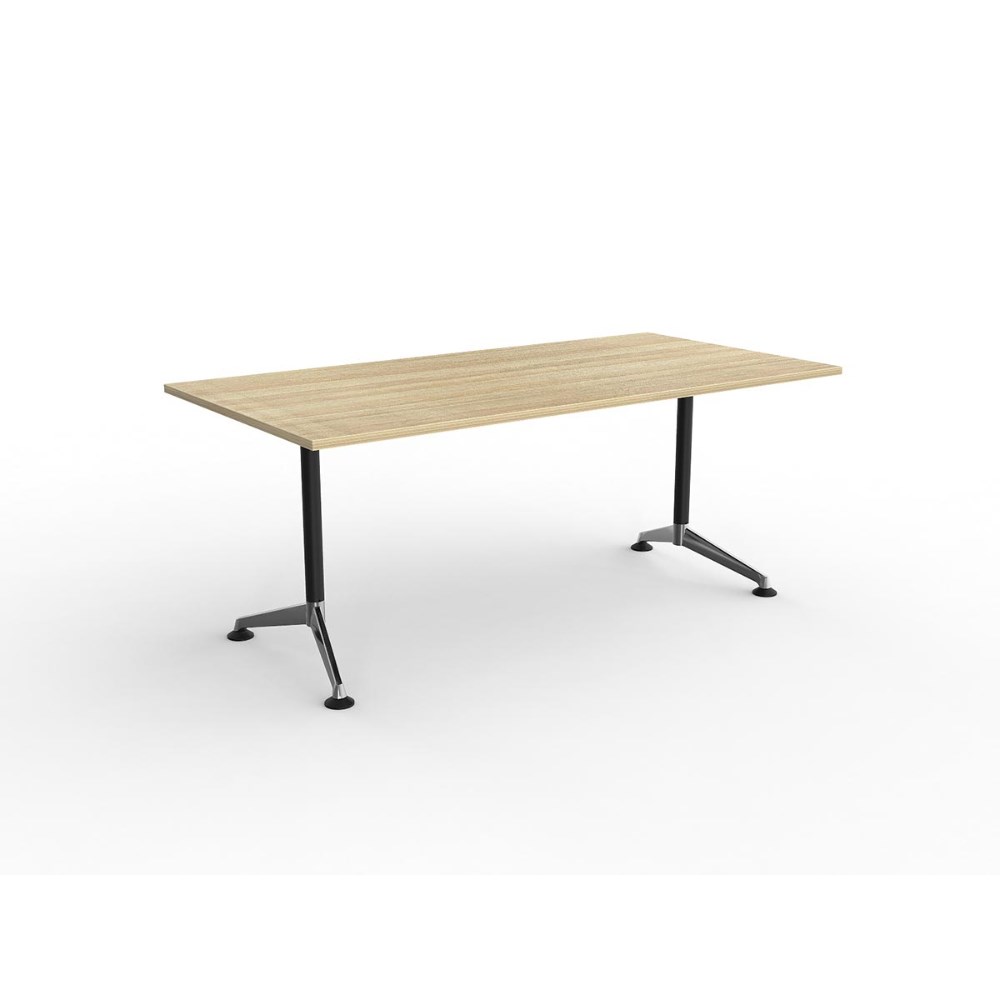 New oak top black frame polished alloy feet. Universal leg style that supports many table designs. Distinctive A-shaped rail and socket system securely locks the table together and gives immense strength. Perfect for boardroom or meeting table. Frames finished in Matt Black powdercoat with polished alloy feet, collars and connectors. 25 mm worksurfaces finished in White melamine on E0 grade substrate with matching PVC edge. Levelling guides. 10 Year Manufacturer's Warranty. Delivery, installation and assembly charges may apply to furniture. Please enquire to confirm.