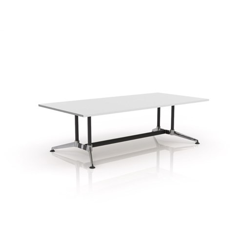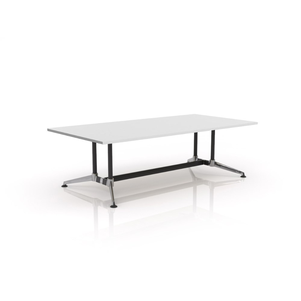 White top black frame polished alloy feet. Distinctive A-shaped rail and socket system securely locks the table together and gives immense strength. Perfect for boardroom or meeting table. Frames finished in Matt Black powdercoat with polished alloy feet, collars and connectors. 25 mm worksurfaces finished in White melamine on E0 grade substrate with matching PVC edge. Levelling guides. 10 Year Manufacturer's Warranty. Delivery, installation and assembly charges may apply to furniture. Please enquire to confirm.