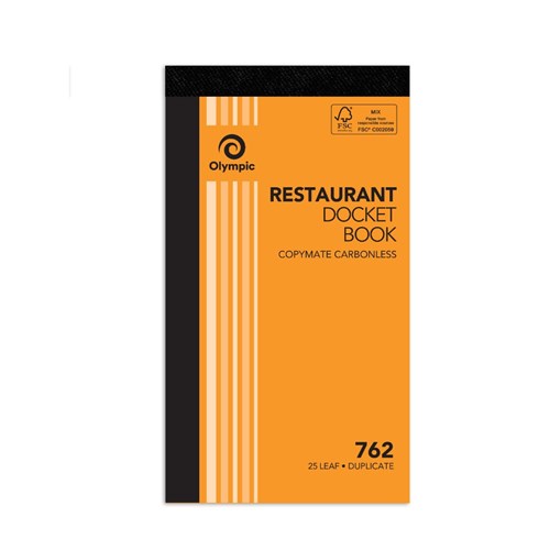 Olympic Cafe Docket Range are ideal for use in cafes, restaurants and take-away food stores 93 x 165mm 25 Leaf, Carbonless Duplicate Sequentially numbered Ideal for use in cafes and restaurants Staple bound