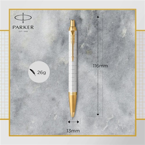 Smart, polished and established designs meet a modern, tapered silhouette. Elegant pearl lacquered body engraved with a modern asymmetric square pattern is complemented by gold trims and the signature Parker arrow clip. Click-action ballpoint tip and reliable Quinkflow Ink deliver smooth, consistent lines everywhere you write. A comfortable and ergonomic shape. Packaged in a distinctive Parker gift box. 2 Year Manufacturer's Warranty.