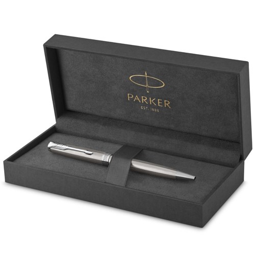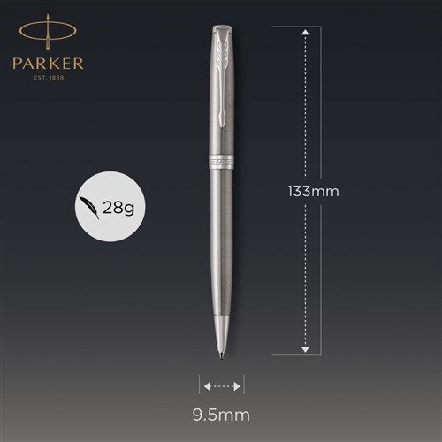 Stainless steel cap and barrel and palladium-finished clip and trim. Ballpoint design with retractable twist mechanism and medium tip. Hand assembled and checked for flawless quality. Available in a range of beautiful designs and finishes. Packaged in a Parker premium gift box. 2 Year Manufacturer's Warranty.