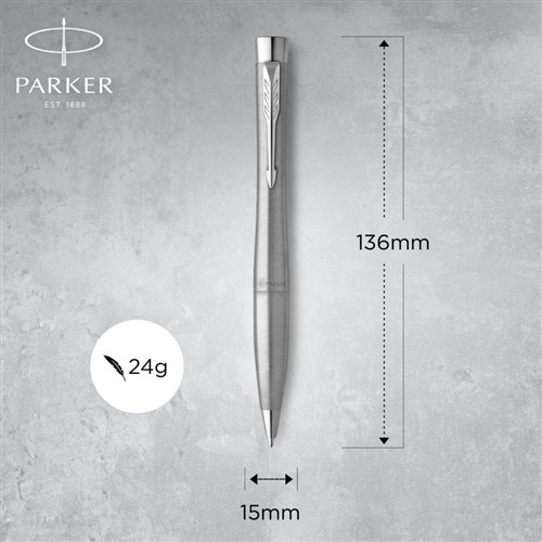 Sleek hourglass curves offer a bold modern look. Signature Parker arrow clip. The refined twist mechanism paired with the reliable Quinkflow ink ensures smooth, consistent lines everywhere you write. Ergonomic shape conforms to your natural grasp, providing the perfect weight and balance. Sophisticated gifting for all occasions, the ballpoint pen is presented in a Parker gift box with one refill. 2 Year Manufacturer's Warranty.