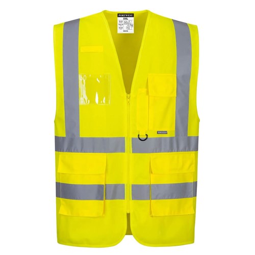 Front zip opening. Reflective tape for increased visibility. Two lower patch pockets. D-ring for keys or ID cards. Dual ID holder allows use of both portrait and landscape ID card display. Radio loop for easy clipping of a radio. 7 pockets for ample storage. Materials: Shell Fabric 100% Polyester Warp Knit 125g.