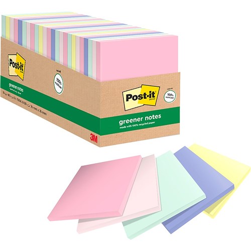 Made from 100% recycled paper fibres. 30% post consumer waste. Plant based adhesive. Convenient storage container. Cabinet packs offer superior value. 24 pads of 75 sheets, total 1,800 sheets.