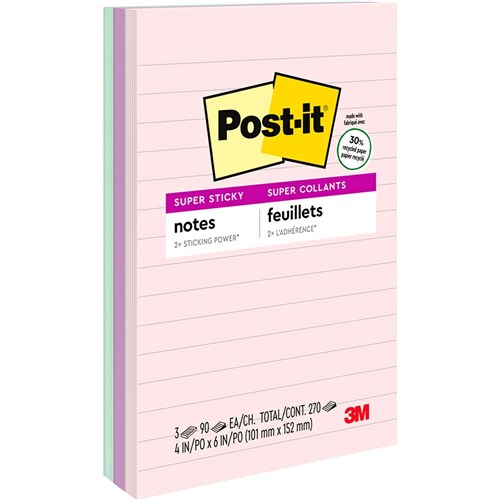 Super Sticky Post-it® adhesive ensures that notes stick practically anywhere such as computer monitors, filing cabinets & furniture, and remain as easily removable as original Post-it® Notes. 90 sheets per pad. Made from 30% post consumer waste.
