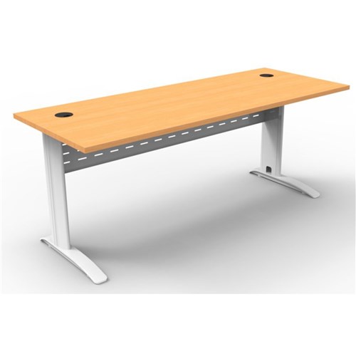Tech Specs - 1800Wx700mmD - E0 Enviroboard Beech Top - White Steel Frame with metal perforated modesty panel - 2 x 80mm diameter cable entry holes - 5 Years Manufacturer's Warranty