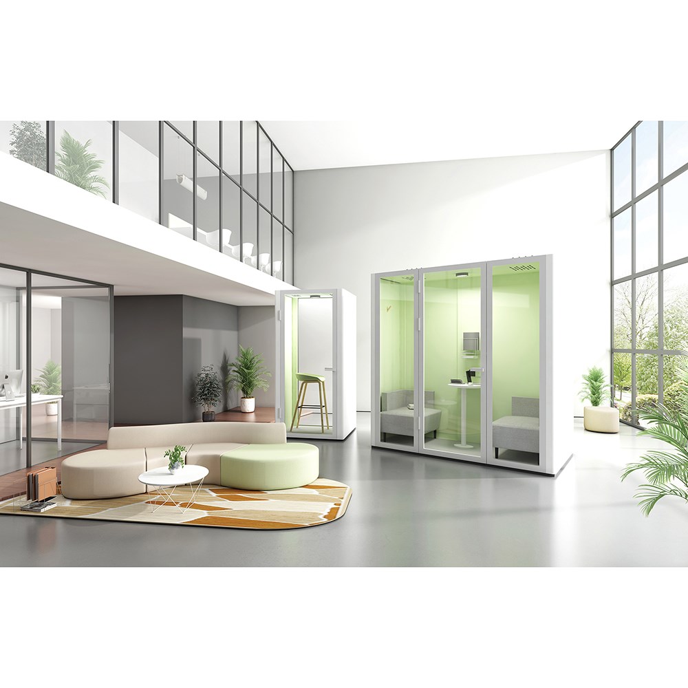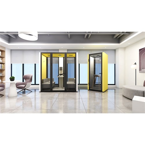 Speech level reduction of 30DB. Air replacement: every 1.8 minutes (total air flow: 2680L/min). Fitted with 1 x LED light (4w 400k). Comes with 8 x ventilation fans, controlled by a door triggered sensor. Fitted with heavy duty castors for easy movement for relocation. Overall Dimension: 2200W x 1500D x 2200mmH. Internal Dimension: 2100W x 1380D x 2080mmH. Doorway Width: 840mm. Sofa Overall Size: 1370W x 580D x 680mmH each. 2 Sofas per Pod. Sofa seat depth: 450, Sofa seat height: 390mmH. Back rest height: 290mm. Table Dimension: 1000W x 500D x 640mmH with rectangular flat plate base underframe. Custom order colours and sizes are also available with an 8-10 weeks lead time. 5 Years Manufacturer's Warranty. Delivery, installation and assembly charges may apply to furniture. Please enquire to confirm.