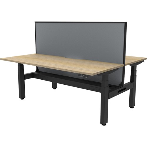 The entire Boost+ range has now been performance tested and is compliant to the AFRDI standards for general safety, strength, durability and stability in all sizes and configurations based on AS/NZS 4442:201. Unit Dimension: 1200mm W x 1500mm D x 1330mm H (Overall). Per User: 1200mm W x 750mm D. Desk Height: 620-1270mm H. Includes pinnable privacy screen in grey fabric with matching black powder coated frame. 900mm H x 30mm T. Smooth and quiet adjustment at 38mm per second. Min Digital control panel with 3 pre-set positions, LED display panel, keypad safety lock and reminder alarm setting. Natural Oak coloured worksurface with 750mm depth top. 50mm D scallop cut out to rear. Back to Back Workstation with Screen and Cable Tray. Dual motor 3 stage motorised legs. 140kg weight loading capacity. 10 Year Manufacturer's Warranty. Delivery, installation and assembly charges may apply to furniture. Please enquire to confirm.