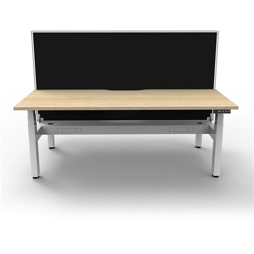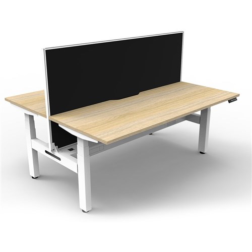 The entire Boost+ range has now been performance tested and is compliant to the AFRDI standards for general safety, strength, durability and stability in all sizes and configurations based on AS/NZS 4442:201. Unit Dimension: 1200mm W x 1500mm D x 1330mm H (Overall). Per User: 1200mm W x 750mm D. Desk Height: 620-1270mm H. Includes pinnable privacy screen in black fabric with matching white powder coated frame. 900mm H x 30mm T. Smooth and quiet adjustment at 38mm per second. Min Digital control panel with 3 pre-set positions, LED display panel, keypad safety lock and reminder alarm setting. Natural Oak coloured worksurface with 750mm depth top. 50mm D scallop cut out to rear. Back to Back Workstation with Screen and Cable Tray. Dual motor 3 stage motorised legs. 140kg weight loading capacity. 10 Year Manufacturer's Warranty. Delivery, installation and assembly charges may apply to furniture. Please enquire to confirm.