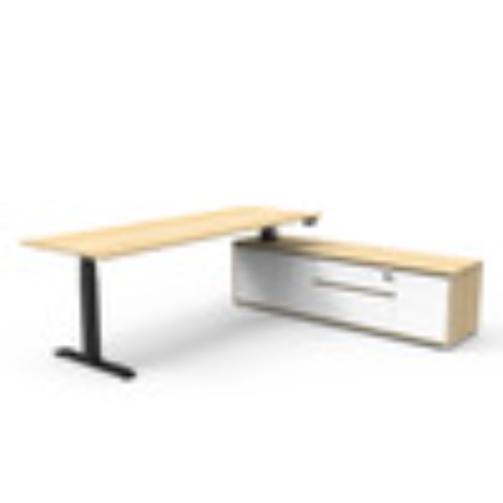 Natural Oak top and Black Satin frame. Height adjustable desk with right hand side cabinet. Desk Dimensions: 2100W x 750D x 620-1270mmH. Side Cabinet Dimensions: 1800W x 500D x 520mmH. Overall Footprint: 2270W x 1936mmD. The desks height-adjustable design utilises dual motors for smooth and effortless adjustments, offering three pre-set positions for personalised comfort. Anti-collision and anti-tilt technology. The integrated side cabinet provides convenient storage with drawers and cupboards, enhancing workspace organisation and efficiency. Powder coated legs. 2 x pull out drawers. 1 x double swing door cupboard. 1 x single swing door cupboard with adjustable shelf. 10 Year Manufacturer's Warranty. Delivery, installation and assembly charges may apply to furniture. Please enquire to confirm.