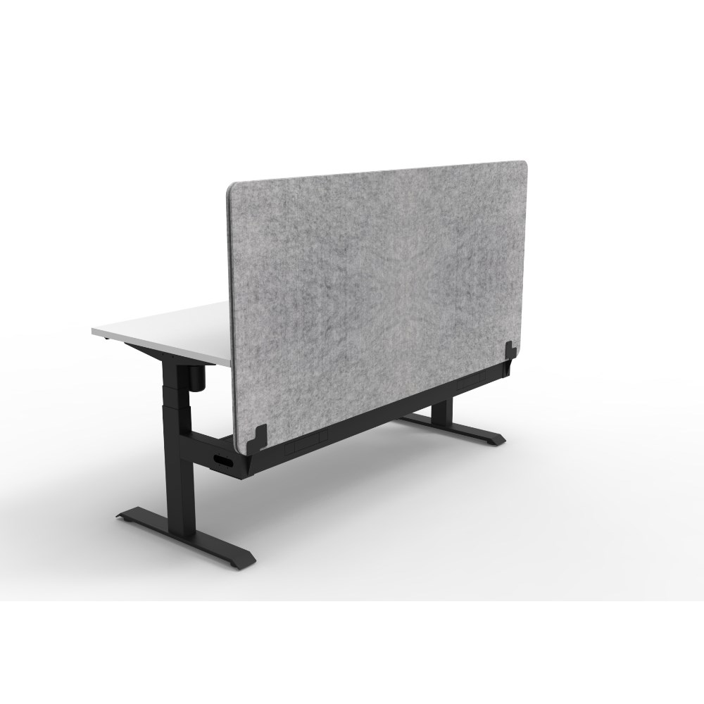 • Electric height adjustable single sided workstation with Natural White top and Black Satin frame, Grey Eco screen and cable tray.