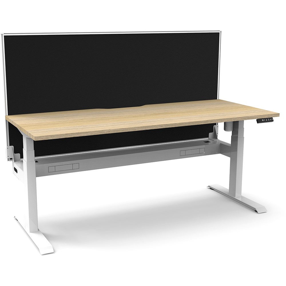 Natural Oak top with White frame. Unit Dimension: 1200mm W x 750mm D x 1330mm H. 620-1270mm height range for desk. E0 rated top. Powdercoat base. Digital control panel with 3 pre-set positions, LED display panel, keypad safety lock & reminder alarm setting. Anti-collision technology, noise emission of less than 50DB. Lifting capacity of 80kg with a max speed of 25mm per second. 700mm wide foot size with adjustable leveling feet. Comes with 30mm thick privacy screens and cable tray for cable management. 10 Year Manufacturer's Warranty. Delivery, installation and assembly charges may apply to furniture. Please enquire to confirm.