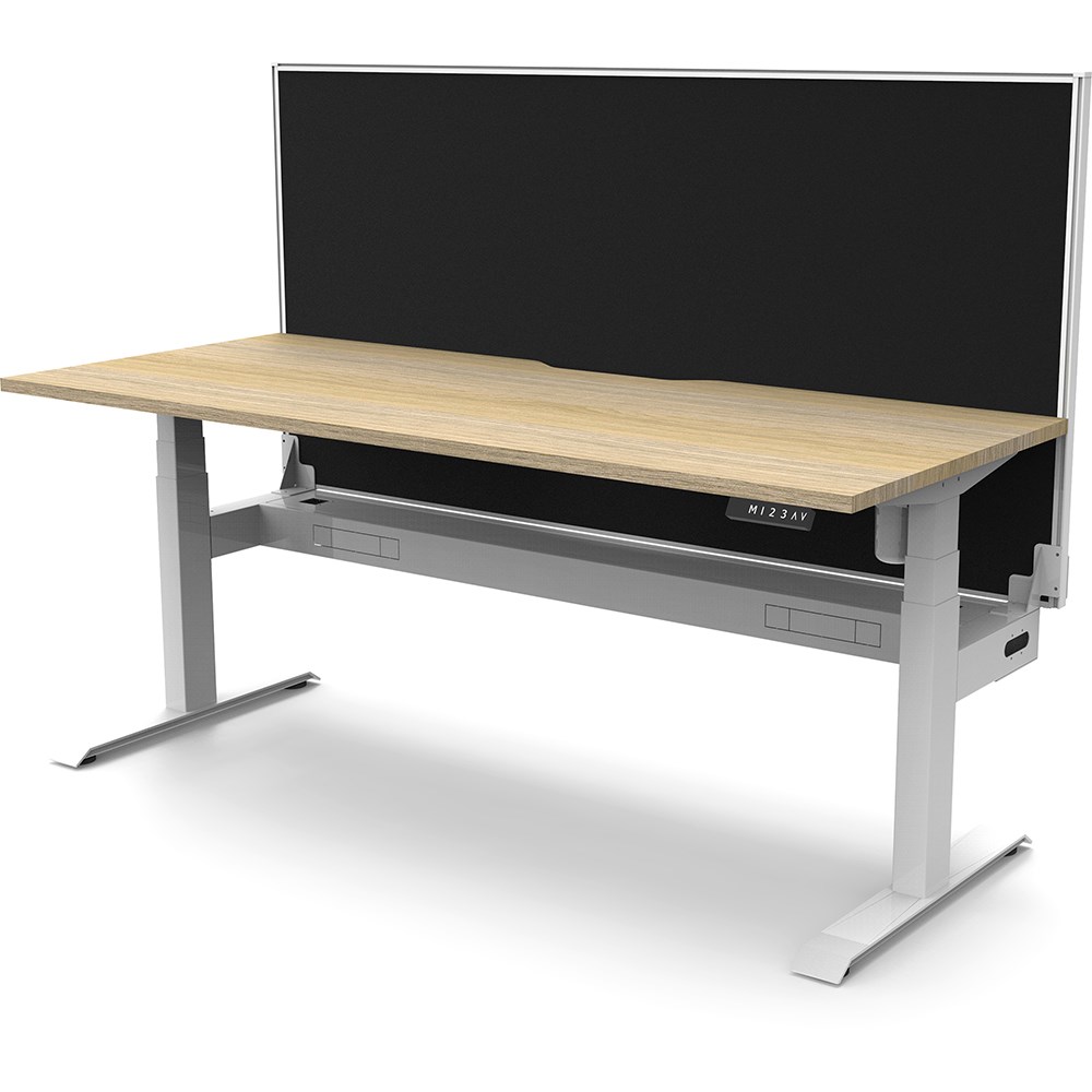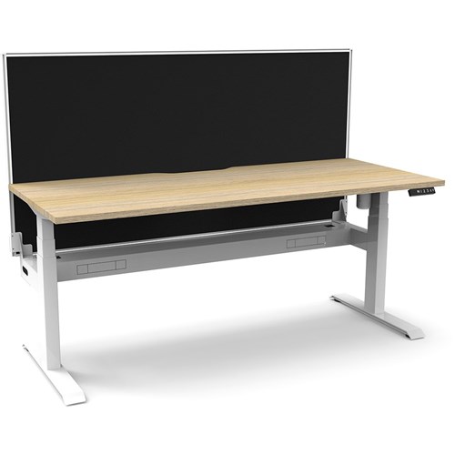 Natural Oak top with White frame. Unit Dimension: 1500mm W x 750mm D x 1330mm H. 620-1270mm height range for desk. E0 rated top. Powdercoat base. Digital control panel with 3 pre-set positions, LED display panel, keypad safety lock & reminder alarm setting. Anti-collision technology, noise emission of less than 50DB. Lifting capacity of 80kg with a max speed of 25mm per second. 700mm wide foot size with adjustable leveling feet. Comes with 30mm thick privacy screens and cable tray for cable management. 10 Year Manufacturer's Warranty. Delivery, installation and assembly charges may apply to furniture. Please enquire to confirm.