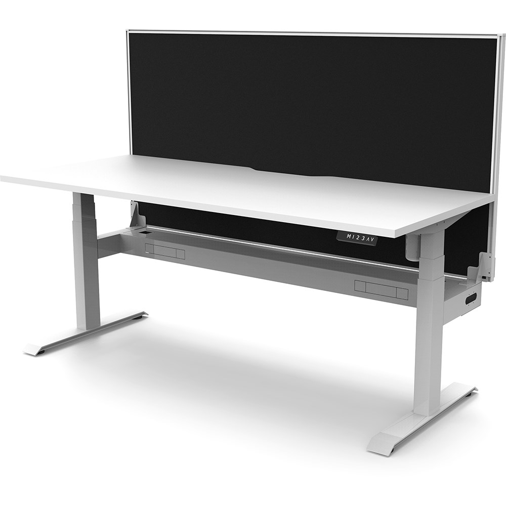 White top with White frame. Unit Dimension: 1500mm W x 750mm D x 1330mm H. 620-1270mm height range for desk. E0 rated top. Powdercoat base. Digital control panel with 3 pre-set positions, LED display panel, keypad safety lock & reminder alarm setting. Anti-collision technology, noise emission of less than 50DB. Lifting capacity of 80kg with a max speed of 25mm per second. 700mm wide foot size with adjustable leveling feet. Comes with 30mm thick privacy screens and cable tray for cable management. 10 Year Manufacturer's Warranty. Delivery, installation and assembly charges may apply to furniture. Please enquire to confirm.