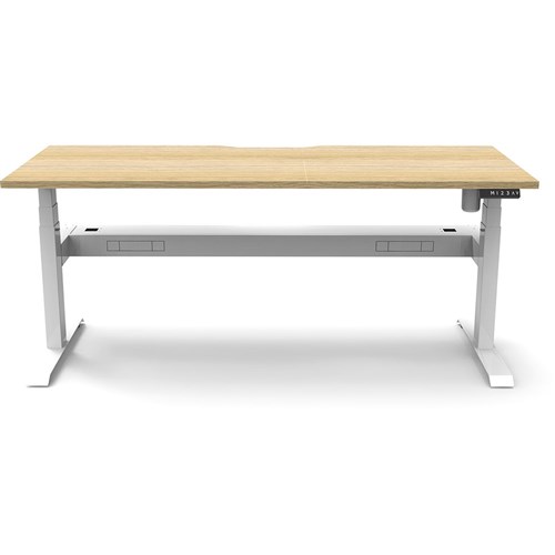 Natural Oak top with White frame. Unit Dimension: 1500mm W x 750mm D x 620-1270mm H. Comes with cable tray for cable management. E0 rated top. Powdercoat base. Digital control panel with 3 pre-set positions, LED display panel, keypad safety lock & reminder alarm setting. Anti-collision technology, noise emission of less than 50DB. Lifting capacity of 80kg with a max speed of 25mm per second. 700mm wide foot size with adjustable leveling feet. 10 Year Manufacturer's Warranty. Delivery, installation and assembly charges may apply to furniture. Please enquire to confirm.