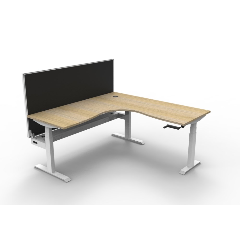 • Rapidline Boost manual crank height adjustable corner workstation with cable tray and screen. Natural oak top with white frame.