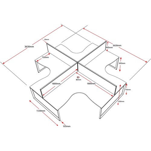 • Overall Including Screen: 3630mm W x 3630mmW x 780mm D x 1200mm H. Per User: 1800mm W x 1800mmW x 750mm D. Desk Height: 730mm.