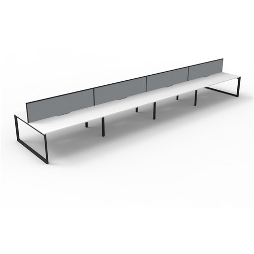 Maximise space and create an efficient working environment with Deluxe Rapid Infinity. With scallop for cable access, and a recessed leg to create full leg access in long runs of workstations. Overall Including Screen: 4800mm W x 1530mm D x 1200mm H. Per User: 1200mm W x 750mm D. Desk Height: 730mm. Includes pinnable privacy screen in grey fabric with matching black powder coated frame. 495mm H x 30mm T. With 410mm W x 50mm D Scallop Cable Access. 60mm x 45mm bevelled edge powder coated Loop Leg underframe. Recessed leg to create full leg access in long runs of workstations. Scalloped top for easy wire management. Double support rail for extra strength. Adjustable levelling feet. E0 Enviroboard. 5 Year Manufacturer's Warranty. Delivery, installation and assembly charges may apply to furniture. Please enquire to confirm.