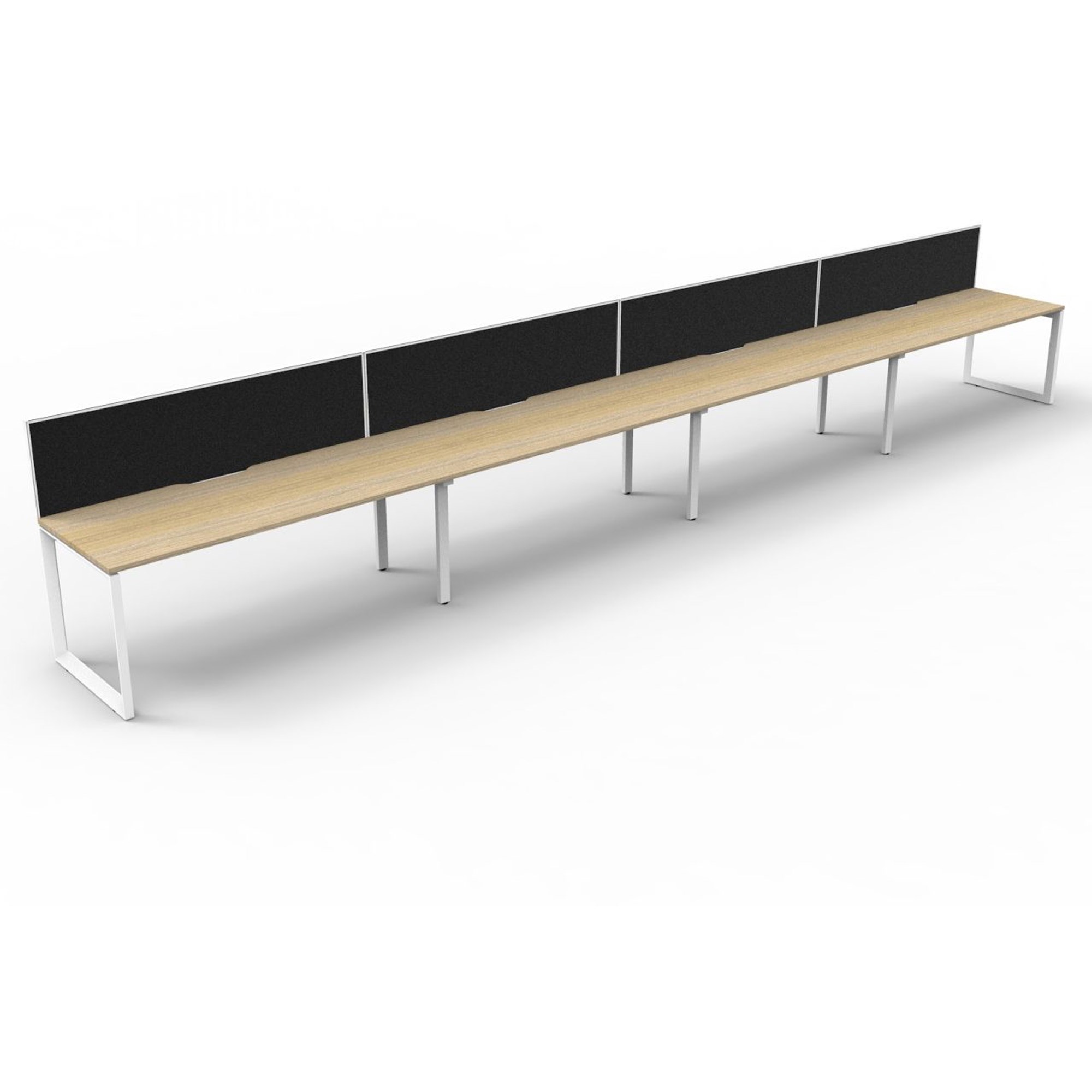 Maximise space and create an efficient working environment with Deluxe Rapid Infinity. Overall Including Screen: 7200mm W x 780mm D x 1200mm H. Per User: 1800mm W x 750mm D. Desk Height: 730mm. Includes pinnable privacy screen in black fabric with matching white powder coated frame. 495mm H x 30mm T. Natural Oak Worksurface With 410mm W x 50mm D Scallop Cable Access. 60mm x 45mm bevelled edge powder coated Loop Leg underframe. Recessed leg to create full leg access in long runs of workstations. Scalloped top for easy wire management. Double support rail for extra strength. Adjustable levelling feet. E0 Enviroboard. 5 Year Manufacturer's Warranty. Delivery, installation and assembly charges may apply to furniture. Please enquire to confirm.