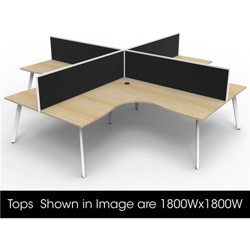 Natural Oak work surface with 80mm diameter cable entry hole. Includes pinnable privacy screen in black fabric with matching white powder coated frame. Overall Including Screens: 3630mm W x 3030mm D x 1200mm H. Per User: 1800/1500mm W x 750mm D. Desk Height: 730mm. 60mm x 30mm splayed leg with power coated underframe. Adjustable levelling feet. E0 Enviroboard. Adjustable levelling feet. 5 Year Manufacturer's Warranty. Delivery, installation and assembly charges may apply to furniture. Please enquire to confirm.