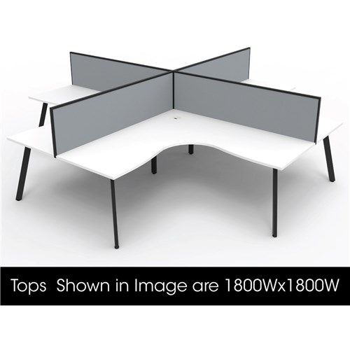 Natural white work surface with black legs and 80mm diameter cable entry hole. Includes pinnable privacy screen in grey fabric with matching black powder coated frame. Overall Including Screens: 3630mm W x 3030mm D x 1200mm H. Per User: 1800/1500mm W x 750mm D. Desk Height: 730mm. 60mm x 30mm splayed leg with power coated underframe. Adjustable levelling feet. E0 Enviroboard. Adjustable levelling feet. 5 Year Manufacturer's Warranty. Delivery, installation and assembly charges may apply to furniture. Please enquire to confirm.