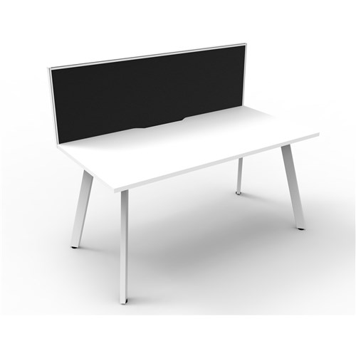 Natural White worksurface with 410mm W x 50mm D with white frame. Scallop cable access. Includes pinnable privacy screen in black fabric with matching white powder coated frame. Overall Including Screen: 1500mm W x 780mm D x 1200mm H. Per User: 1500mm W x 750mm D. Desk Height: 730mm H. 60mm x 30mm splayed leg with power coated underframe. Adjustable levelling feet. E0 Enviroboard. 5 Year Manufacturer's Warranty. Delivery, installation and assembly charges may apply to furniture. Please enquire to confirm.