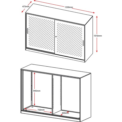 CATEGORY 1 WARNING: This product has a high risk of toppling over. Children have died from furniture tipover. ALWAYS secure this furniture with an anchor device. GO perforated sliding door cupboard with 2 doors. Includes 2 x adjustable shelves - 1 on each side. Perforated door feature with internal acoustic panel for sound absorption. Adjustable leveling feet. Soft closing track system. Lockable doors - comes with 2 keys. 10 Year Manufacturer's Warranty.