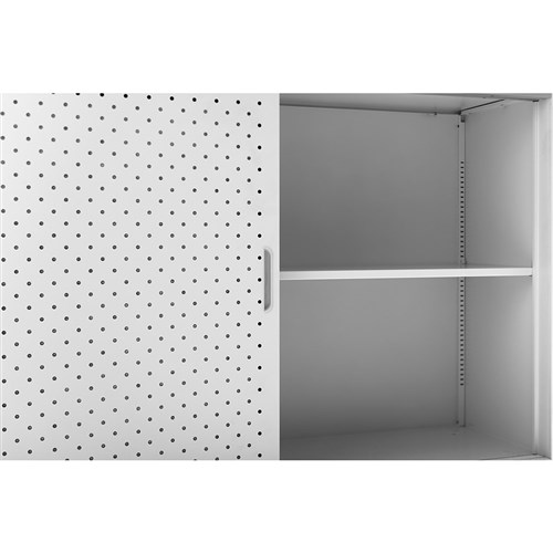 CATEGORY 1 WARNING: This product has a high risk of toppling over. Children have died from furniture tipover. ALWAYS secure this furniture with an anchor device. GO perforated sliding door cupboard with 2 doors. Includes 2 x adjustable shelves - 1 on each side. Perforated door feature with internal acoustic panel for sound absorption. Adjustable leveling feet. Soft closing track system. Lockable doors - comes with 2 keys. 10 Year Manufacturer's Warranty.