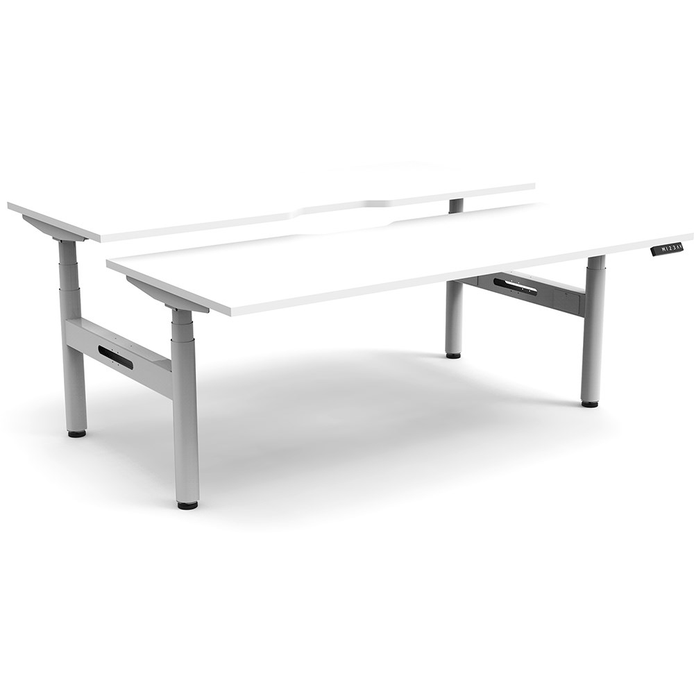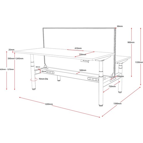 White top with White frame. Unit Dimension: 1200mm W x 1500mm D x 620-1270mm H. 750mm depth per user. E0 rated top. Powdercoat base. Digital control panel with 3 pre-set positions, LED display panel, keypad safety lock & reminder alarm setting. Anti-collision technology, noise emission of less than 50DB. Lifting capacity of 120kg with a max speed of 38mm per second. 70mm diameter round column legs. 700mm wide foot size with adjustable leveling feet, return foot: 700mm. 10 Year Manufacturer's Warranty. Delivery, installation and assembly charges may apply to furniture. Please enquire to confirm.