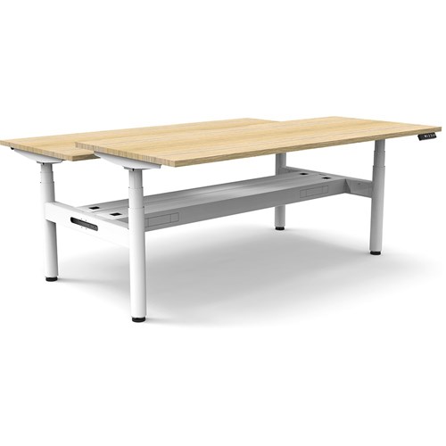 Natural Oak top with White frame. Unit Dimension: 1200mm W x 1500mm D x 620-1270mm H. 750mm depth per user. E0 rated top. Powdercoat base. Digital control panel with 3 pre-set positions, LED display panel, keypad safety lock & reminder alarm setting. Anti-collision technology, noise emission of less than 50DB. Lifting capacity of 120kg with a max speed of 38mm per second. 70mm diameter round column legs. 700mm wide foot size with adjustable leveling feet, return foot: 700mm. Comes with cable tray for cable management. 10 Year Manufacturer's Warranty. Delivery, installation and assembly charges may apply to furniture. Please enquire to confirm.