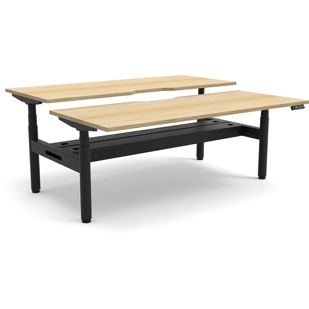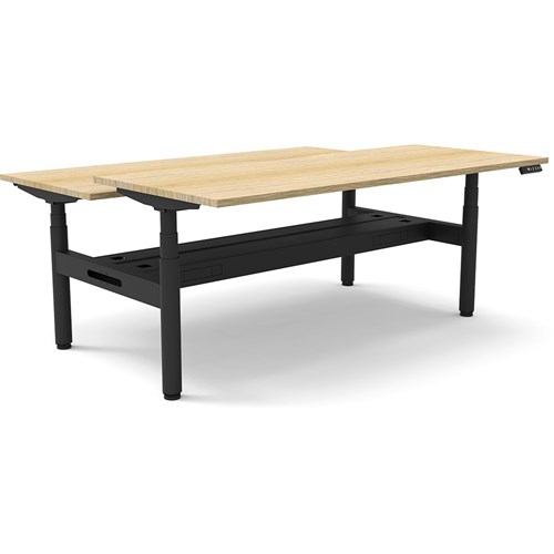 Natural Oak top with Black frame. Unit Dimension: 1800mm W x 1500mm D x 620-1270mm H. 750mm depth per user. E0 rated top. Powdercoat base. Digital control panel with 3 pre-set positions, LED display panel, keypad safety lock & reminder alarm setting. Anti-collision technology, noise emission of less than 50DB. Lifting capacity of 120kg with a max speed of 38mm per second. 70mm diameter round column legs. 700mm wide foot size with adjustable leveling feet, return foot: 700mm. Comes with cable tray for cable management. 10 Year Manufacturer's Warranty. Delivery, installation and assembly charges may apply to furniture. Please enquire to confirm.