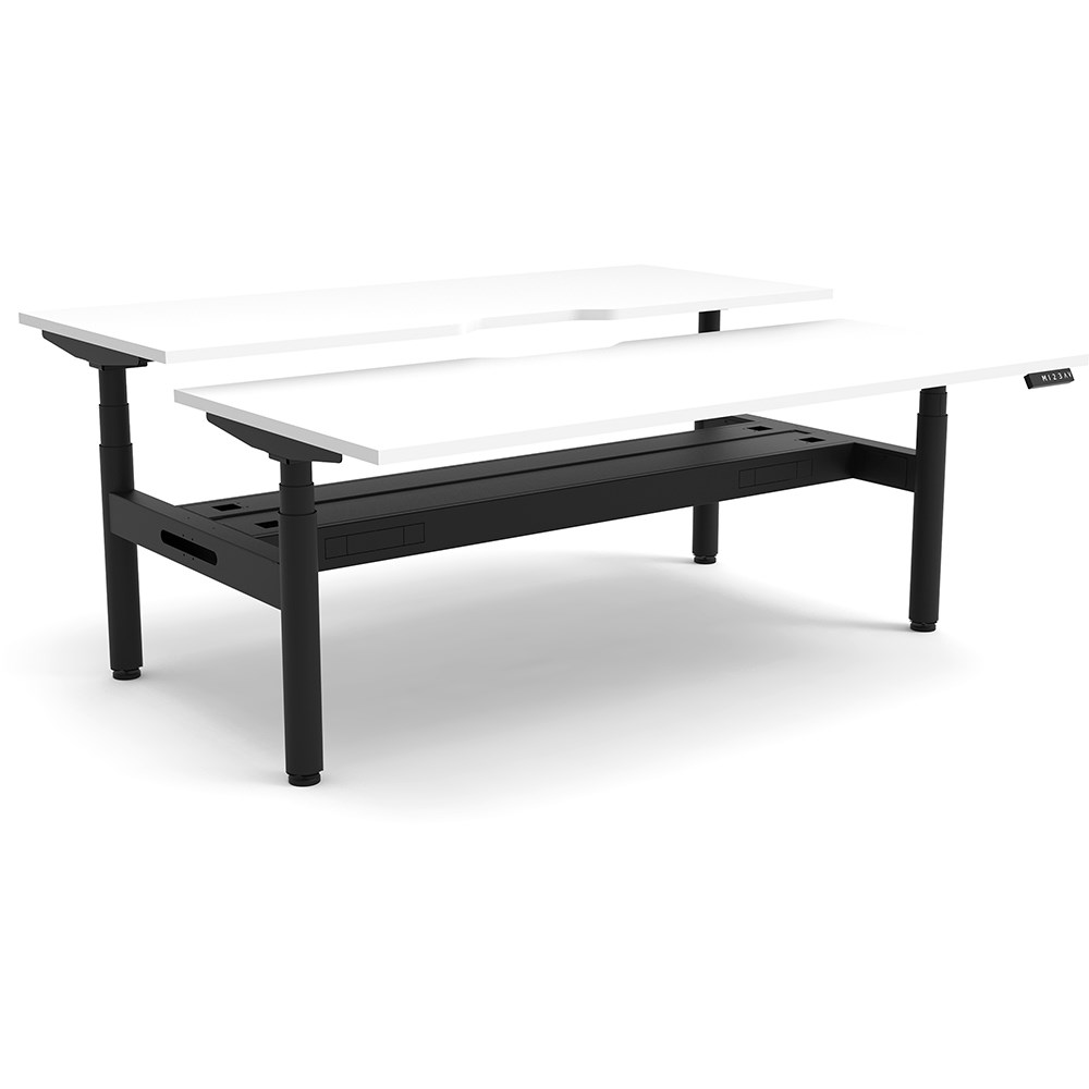 White top with Black frame. Unit Dimension: 1800mm W x 1500mm D x 620-1270mm H. 750mm depth per user. E0 rated top. Powdercoat base. Digital control panel with 3 pre-set positions, LED display panel, keypad safety lock & reminder alarm setting. Anti-collision technology, noise emission of less than 50DB. Lifting capacity of 120kg with a max speed of 38mm per second. 70mm diameter round column legs. 700mm wide foot size with adjustable leveling feet, return foot: 700mm. Comes with cable tray for cable management. 10 Year Manufacturer's Warranty. Delivery, installation and assembly charges may apply to furniture. Please enquire to confirm.