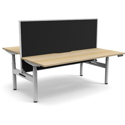 Natural Oak top with White frame. Unit Dimension: 1500mm W x 1500mm D x 1330mm H. 620-1270mm height range for desk, 750mm depth per user. E0 rated top. Powdercoat base. Digital control panel with 3 pre-set positions, LED display panel, keypad safety lock & reminder alarm setting. Anti-collision technology, noise emission of less than 50DB. Lifting capacity of 120kg with a max speed of 38mm per second. 70mm diameter round column legs. 700mm wide foot size with adjustable leveling feet, return foot: 700mm. Comes with 30mm thick privacy screen. 10 Year Manufacturer's Warranty. Delivery, installation and assembly charges may apply to furniture. Please enquire to confirm.
