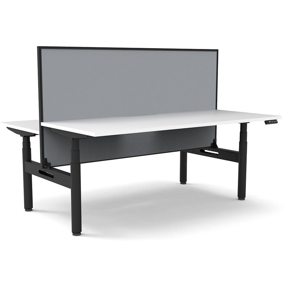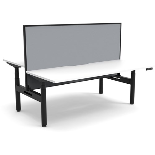 White top with Black frame. Unit Dimension: 1800mm W x 1500mm D x 1330mm H. 620-1270mm height range for desk, 750mm depth per user. E0 rated top. Powdercoat base. Digital control panel with 3 pre-set positions, LED display panel, keypad safety lock & reminder alarm setting. Anti-collision technology, noise emission of less than 50DB. Lifting capacity of 120kg with a max speed of 38mm per second. 70mm diameter round column legs. 700mm wide foot size with adjustable leveling feet, return foot: 700mm. Comes with 30mm thick privacy screen. 10 Year Manufacturer's Warranty. Delivery, installation and assembly charges may apply to furniture. Please enquire to confirm.