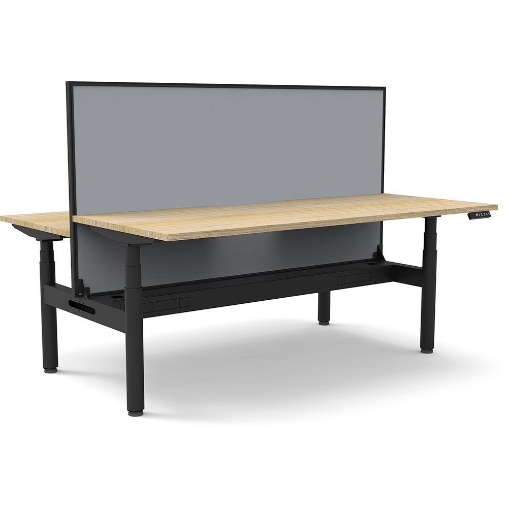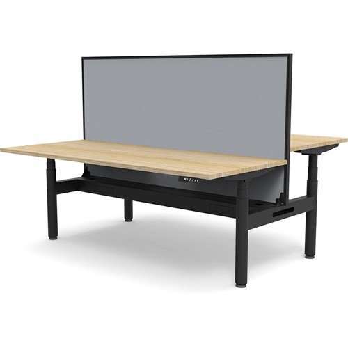 Natural Oak top with Black frame. Unit Dimension: 1200mm W x 1500mm D x 1330mm H. 620-1270mm height range for desk, 750mm depth per user. E0 rated top. Powdercoat base. Digital control panel with 3 pre-set positions, LED display panel, keypad safety lock & reminder alarm setting. Anti-collision technology, noise emission of less than 50DB. Lifting capacity of 120kg with a max speed of 38mm per second. 70mm diameter round column legs. 700mm wide foot size with adjustable leveling feet, return foot: 700mm. Comes with 30mm thick privacy screens and cable tray for cable management. 10 Year Manufacturer's Warranty. Delivery, installation and assembly charges may apply to furniture. Please enquire to confirm.