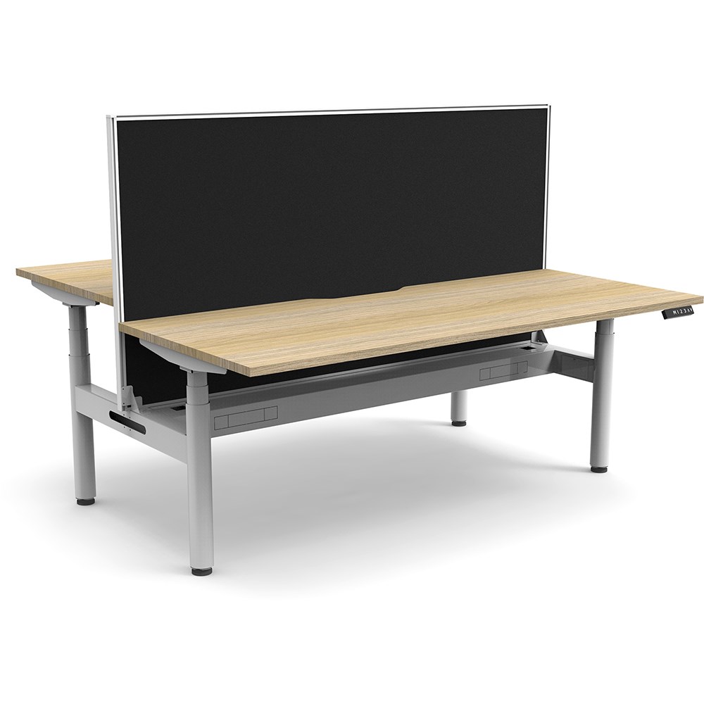 Natural Oak top with White frame. Unit Dimension: 1200mm W x 1500mm D x 1330mm H. 620-1270mm height range for desk, 750mm depth per user. E0 rated top. Powdercoat base. Digital control panel with 3 pre-set positions, LED display panel, keypad safety lock & reminder alarm setting. Anti-collision technology, noise emission of less than 50DB. Lifting capacity of 120kg with a max speed of 38mm per second. 70mm diameter round column legs. 700mm wide foot size with adjustable leveling feet, return foot: 700mm. Comes with 30mm thick privacy screens and cable tray for cable management. 10 Year Manufacturer's Warranty. Delivery, installation and assembly charges may apply to furniture. Please enquire to confirm.