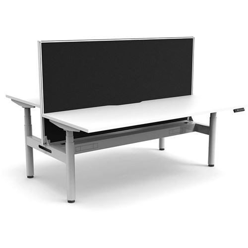 White top with White frame. Unit Dimension: 1500mm W x 1500mm D x 1330mm H. 620-1270mm height range for desk, 750mm depth per user. E0 rated top. Powdercoat base. Digital control panel with 3 pre-set positions, LED display panel, keypad safety lock & reminder alarm setting. Anti-collision technology, noise emission of less than 50DB. Lifting capacity of 120kg with a max speed of 38mm per second. 70mm diameter round column legs. 700mm wide foot size with adjustable leveling feet, return foot: 700mm. Comes with 30mm thick privacy screens and cable tray for cable management. 10 Year Manufacturer's Warranty. Delivery, installation and assembly charges may apply to furniture. Please enquire to confirm.