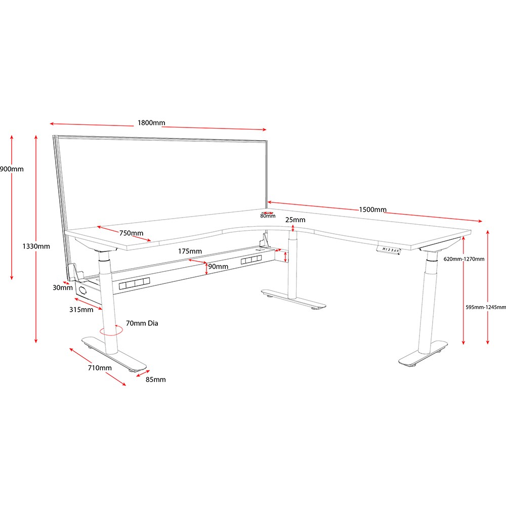 White top with White frame. Unit Dimension: 1800/1500mm W x 750mm D x 620-1270mm H. E0 rated top. Powdercoat base. Digital control panel with 3 pre-set positions, LED display panel, keypad safety lock & reminder alarm setting. Anti-collision technology, noise emission of less than 50DB. Lifting capacity of 120kg with a max speed of 38mm per second. 70mm diameter round column legs. 700mm wide foot size with adjustable leveling feet, return foot: 700mm. 10 Year Manufacturer's Warranty. Delivery, installation and assembly charges may apply to furniture. Please enquire to confirm.